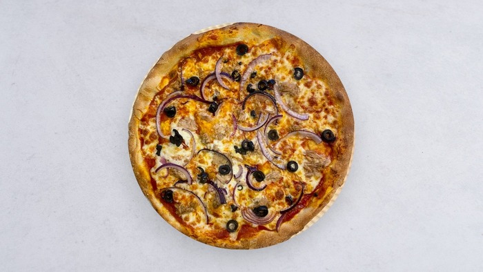 tuńczyk, czarne oliwki, czerwona cebula, mozzarella fior di latte, sos pomidorowy, oregano