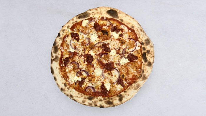 pikantna kiełbasa nduja, czerwona cebula, mascarpone, mozzarella fior di latte, sos pomidorowy, oregano