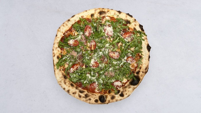 szynka parmeńska, pomidorki koktajlowe, rukola, parmezan, mozzarella fior di latte, sos pomidorowy, oregano