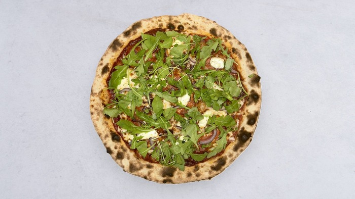 konfitura śliwkowa, salami piccante, mascarpone, czerwona cebula, rukola, mozzarella fior di latte, sos pomidorowy, oregano